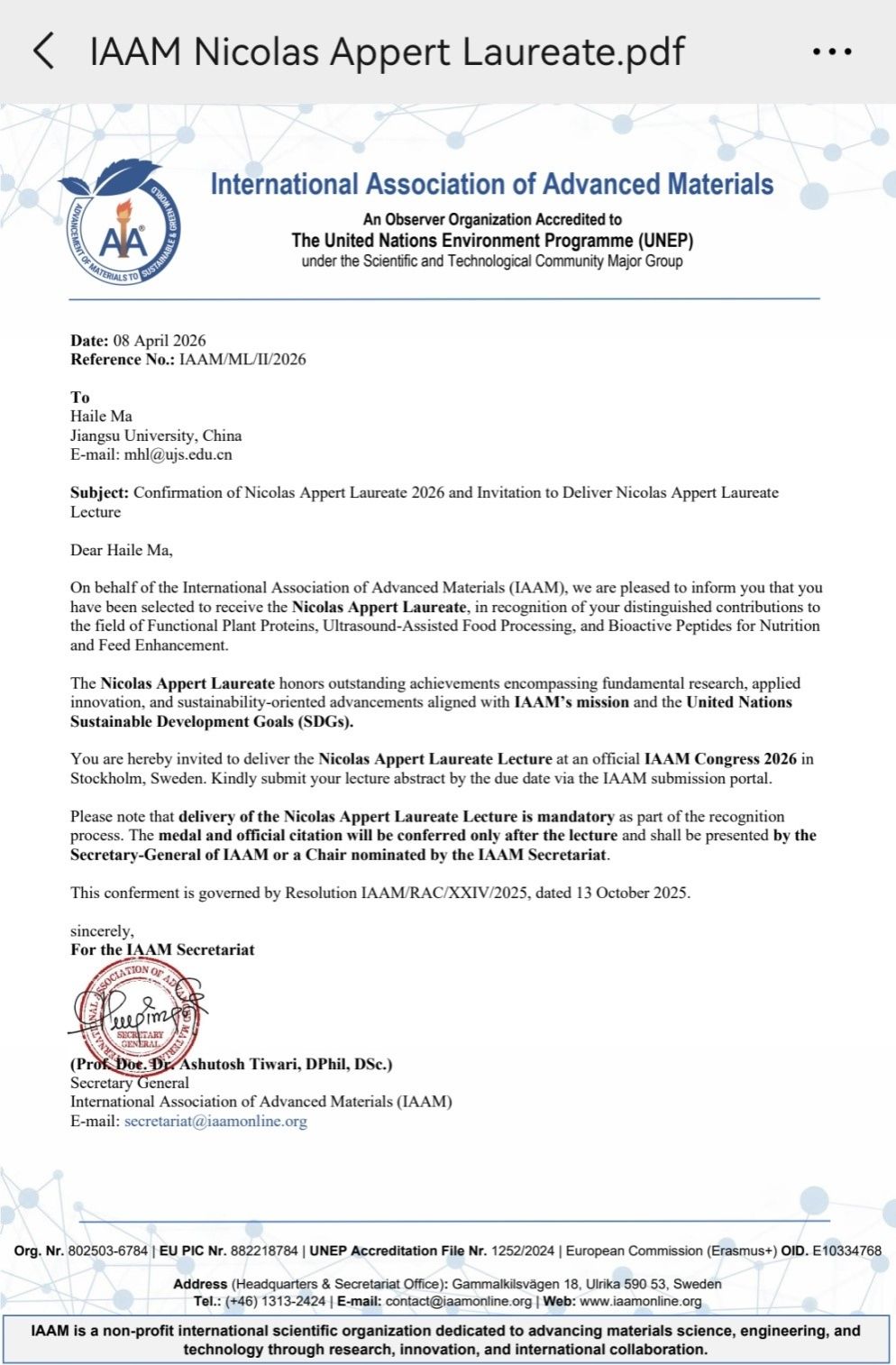 4月9日国际先进材料学会(IAAM)向我校食品物理加工研究院院长马海乐教授发来邮件,通知他被评选为本年度尼古拉斯·阿佩尔奖得主(Nicolas Appert Laureate),以表彰其在功能性植物蛋白、超声辅助食品加工以及应用于营养与饲料强化的生物活性肽领域所做出的杰出且开创性的贡献,认为这些贡献显著推动了科学知识的进步,并产生了深远的社会影响。
